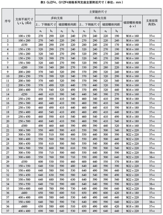 2.3GJZF4、GYZF4規(guī)格系列支座主要附近尺寸