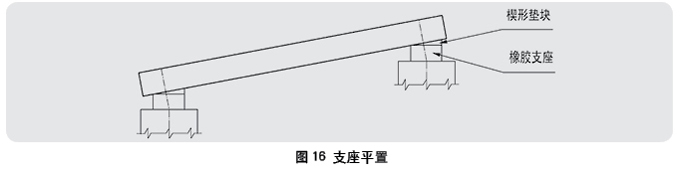 4.1普通板式橡膠支座的安裝 7.1.1現(xiàn)澆梁橡膠支座的安裝 A、先將支座墊石頂面清理干凈,若激臺墊石的標(biāo)高差距過大,可用水泥砂漿調(diào)整。 B、在支座墊石上按設(shè)計(jì)圖標(biāo)出支座位置中心線,同時(shí)在橡膠支座上也標(biāo)出十字交叉中心線,將橡膠支座 的中心線與墊石中心線相吻合,支座即就位準(zhǔn)確。 C、在澆注混凝土梁體前,在橡肢支座上設(shè)一塊比支座平面稍大的支承鋼板、鋼板焊錫固筋與梁體連接。 將支承鋼板視為現(xiàn)澆梁模板的一部分進(jìn)行澆注。為防止漏漿,可在支承鋼板與模板四周空隙處,用棉砂、油灰 或其它物質(zhì)填設(shè)。 8.1.2預(yù)制梁橡膠支座的安裝 A、首先將橡膠支座按設(shè)計(jì)要求直接放置在支座墊石上,墊石上面必須亊先清理干凈,并保證平整,然后 將上部構(gòu)造直接安放在支座上。 B、架梁落梁安裝時(shí)應(yīng)平穩(wěn),防止支座偏心受壓或產(chǎn)生初始剪切變形。 C、在T型梁安裝時(shí),若支座比梁肋底寬(應(yīng)盡量避免),則應(yīng)在支座與梁底之間用鋼筋混凝土墊塊或厚 鋼板作過渡,以免橡膠支座受力面積減少造成應(yīng)力集中。 8.1.3普通板式橡膠支座的安裝亊項(xiàng) A、支座安裝時(shí),必須保證位置準(zhǔn)確,調(diào)整時(shí),避免產(chǎn)生過大的剪切變形,安裝時(shí)間最好在相當(dāng)于全年平 均氣湛時(shí)進(jìn)行,以保證因低溫或高溫時(shí)造成支座偏離中心的位置不致過大,減少剪切變形。 如必須在高溫或低溫時(shí)安裝,可采取以下措施。 a待到全年平均氣溫時(shí),頂起主梁、將支座調(diào)整到中心位置。 b在安裝時(shí)根據(jù)當(dāng)時(shí)氣湛計(jì)算使支座產(chǎn)生預(yù)變形。 c也可以在設(shè)計(jì)選用橡膠支座時(shí),適當(dāng)增高支座髙度,使其比原設(shè)計(jì)支座的剪切變形量大。 B、要保證支座和墩臺及主梁緊密結(jié)合成一體,與橡膠支座接觸的上部構(gòu)造底面和墩臺面必須清潔平整。 如不平整要用水泥砂漿找平。 C、使用普通板式橡膠支座一般沒用固定纗與活動端之分,使用等髙支座時(shí),上部構(gòu)造的水平位移由同一 片梁兩纗支座的剪切變形共同完成,各承擔(dān)一半。也可用厚度較小的橡膠支座作固定支座。 D、當(dāng)梁體在縱向有坡度時(shí),可按以下幾種情況分別處理。 a梁體縱坡<=1%時(shí),縱坡由支座墊石調(diào)整支座斜置。如圖15 b梁體縱坡時(shí),在梁底與支座之間粘結(jié)一塊與梁縱坡一致的楔型墊塊,支座平置。如圖16 也可采用梁底一端削去與坡度相一致的一角,在另一端補(bǔ)上與削去部分相等的一角,使支座平置。如圖17 C為了方便施工可直接選用坡度板式橡膠支座。 E支座安裝時(shí),要考慮到以后更換調(diào)整橡膠支座的需要,通常采用在支座周邊空間設(shè)置各種凹樁以便安 放千斤頂。4.2聚四氟乙烯滑板式橡膠支座的安裝 7.2.1四氟板式橡膠支座的構(gòu)造與聯(lián)接 a構(gòu)造:四氟支座的整體結(jié)構(gòu)有“封閉型”和“簡易型”兩種。對城市橋梁及紫外線輯射、空氣污染與 粉塵嚴(yán)重地區(qū),選用封閉型結(jié)構(gòu),其它場合可采用簡易型。簡易型和封閉型分別見圖18和圖19。 b聯(lián)接:四氟板式橡膠支座下鋼板的聯(lián)接可在激臺支承墊石上頂留相應(yīng)凹坑。架梁時(shí)下鋼板用環(huán)氧樹脂砂 漿粘結(jié)于坑內(nèi),四氟板式橡膠支座的上鋼板澆梁施工時(shí),可采用鋼板焊描固筋一同澆注。預(yù)制梁施工時(shí),上鋼 板用環(huán)氣樹脂砂漿與梁底粘結(jié)。 環(huán)氧樹臘砂漿配合比(重量比) 環(huán)氧樹臘(6101 ) : 100,乙二胺:8—10或三乙烯四胺:8—12 苯二甲酸二丁脂:12 水泥或石英粉或細(xì)砂:250-300 8.2.2四氟板式支座安裝應(yīng)注意亊項(xiàng) 四氟板式支座的安裝方法與普通板式支座基本相同,但應(yīng)注意下列亊項(xiàng)。 a四氟板式支座系作活動支座用,應(yīng)同普通板式支座(作固定支座)配套使用。安裝時(shí)應(yīng)精心細(xì)致。 支座應(yīng)按設(shè)計(jì)支承中心準(zhǔn)確就位。梁底鋼板與支承墊石(或下鋼板)頂面盡可能保持平行,同支座上下 面全部密貼;同一片梁的各個(gè)支座位置應(yīng)在同一平面上;避免支座的偏受壓、不均勻支承與個(gè)別脫空現(xiàn)象。 b與四氟板接觸的不銹鋼板表面不允許有損傷、拉毛現(xiàn)象;以免增大摩擦系數(shù)及損壞四氟板。 c支座四氟面的儲油凹坑內(nèi),安裝時(shí)應(yīng)涂刷不易揮發(fā)的“5201桂脂”作潤滑劑以降低摩擦系數(shù)。 d支座與不銹鋼板的位置視安裝時(shí)溫度而定,若不銹鋼板有足夠長度,則任何季節(jié)都可使支座居不銹鋼板 中心位置。 e落梁時(shí),為防止梁與支座發(fā)生縱橫向滑移,宜用木制三角勢塊在梁體兩側(cè)加以定位,待落梁工作全部完 畢后拆除。 f上部結(jié)構(gòu)為連續(xù)體系時(shí),固定端橡膠支座為提高可靠度,防止固定支座的縱橫滑移,可設(shè)置防爬裝置。